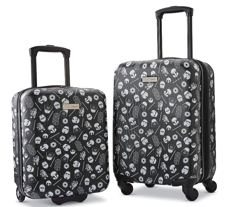 Okay, how cool is this set? Both rolling suitcases are covered in a black and white print featuring the Star Wars logo and some of your favorite characters, and the inside lining looks like the night sky! The textured outer shell provides durability and protection to your belongings. Extendable handles on both the 18 inch upright and 20 inch spinner allow you to adjust to your height. The interior has three different zippered compartments as well as a bright blue compression strap to really maximize your space. This set would be great for carry on luggage!