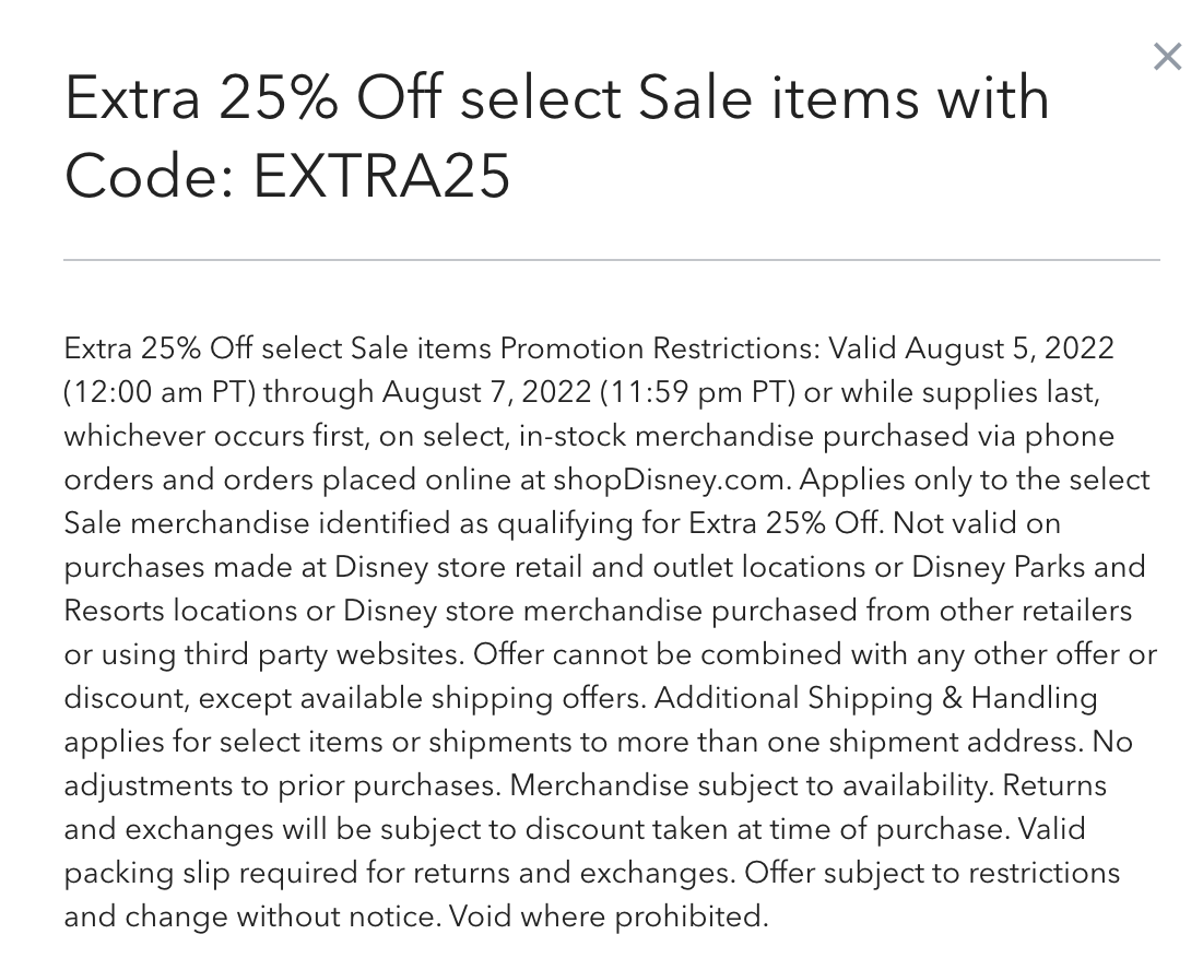 Head to shopDisney and use the code EXTRA25 to take advantage of this promotion. You can also use code SHIPMAGIC for free shipping on orders of $75 or more, and if you’re using your Disney Rewards Visa Card, you can also use code DRVCMEMBER for an additional 10% off your whole order!