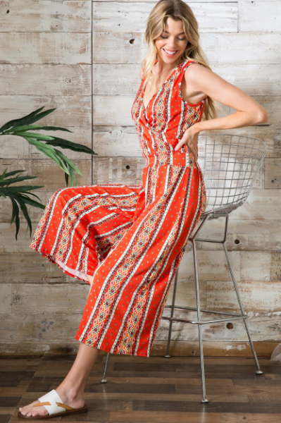 Jump into this jumpsuit with a tropical print in the perfect summer shade! We love taking a cue from these hot temperatures by wearing equally spicy colors, like this bright orange-red. This piece is a great item to keep in your wardrobe for those days when you want to look cute but don’t have the time or energy to put together an entire outfit. Just throw on this jumpsuit and you’re ready to go!
