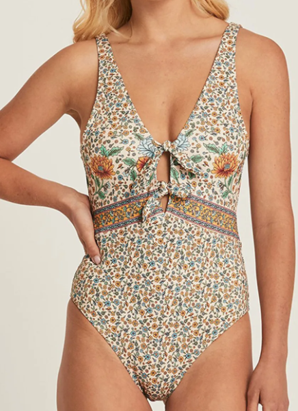 Vintage fans will love this suit! We wanted to showcase this tie-front one piece because we adore the retro floral print. The warm, subdued tones and two front ties are so adorable! It’s easy to imagine lounging by the pool in this suit with a straw hat on.