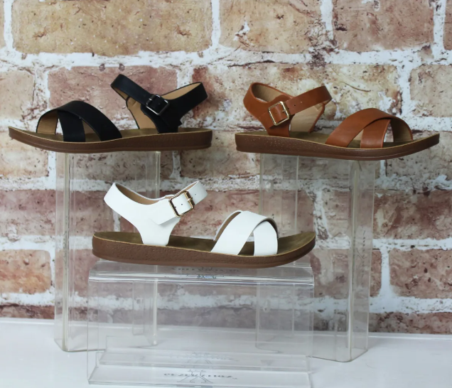 Style and comfort meet in the middle with these sandals! The soles will support your feet and provide a tiny bit of height with their 1 inch platform. The faux leather straps cross over the top of your foot and wrap around your ankle, and are fastened by a gold buckle.