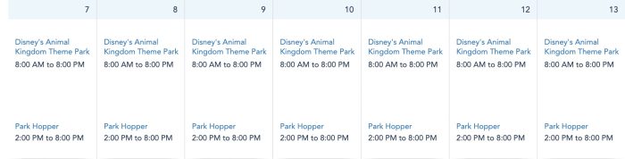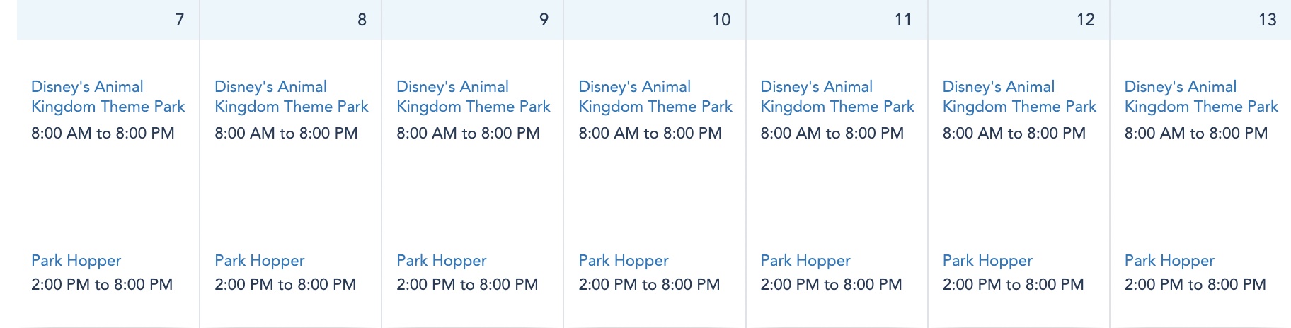 Finally, we come to Disney’s Animal Kingdom. Animal Kingdom will be open every day next week from 8AM-8PM.
