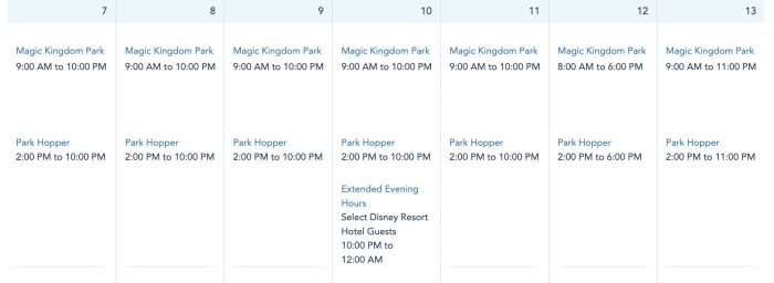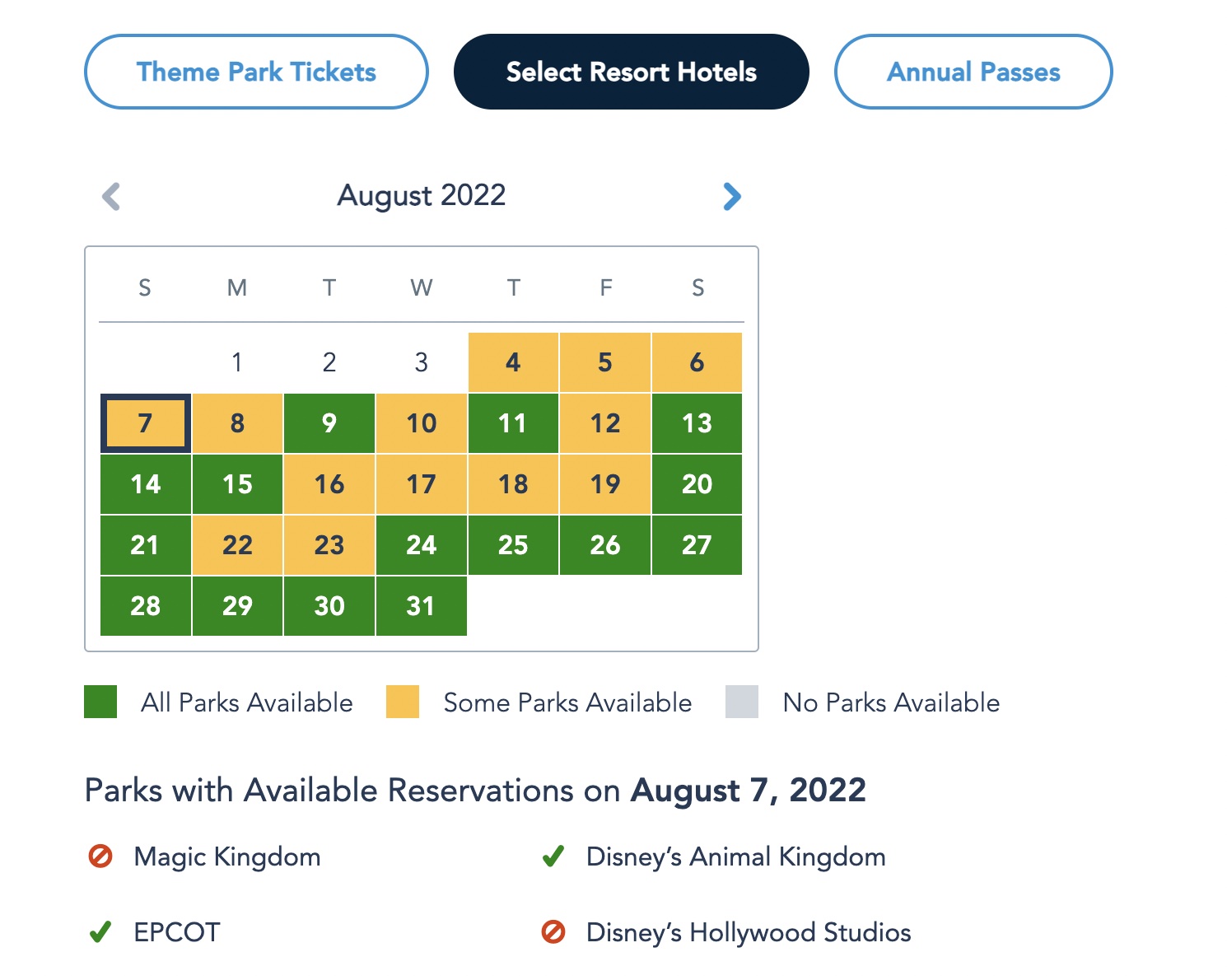 For guests who have a Theme Park ticket, Magic Kingdom and Hollywood Studios are unavailable on August 7th, 8th, 10th, and 12th. All of the parks are available on August 9th, 11th, and 13th.