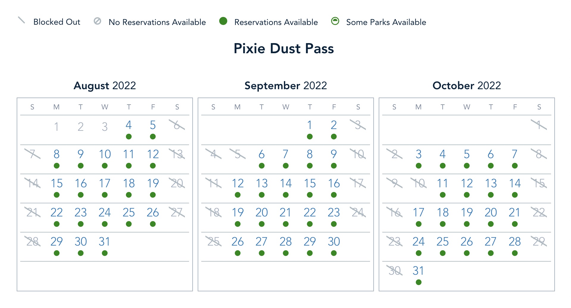 And finally, we have the Pixie Dust Pass. This pass is blocked out on weekends (which means that you aren’t able to get into the parks with it), but it has open availability for all four theme parks next week.