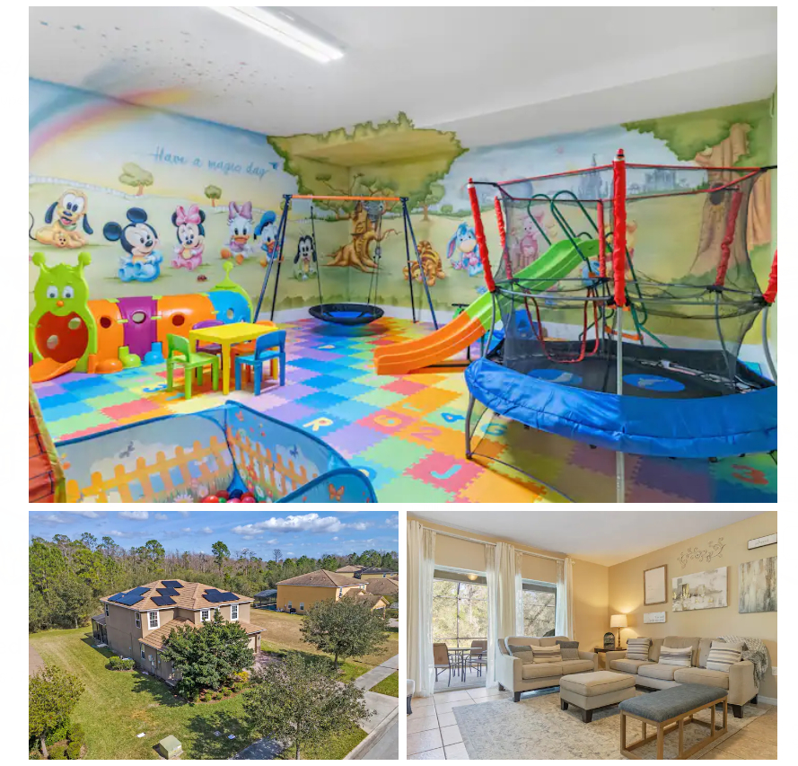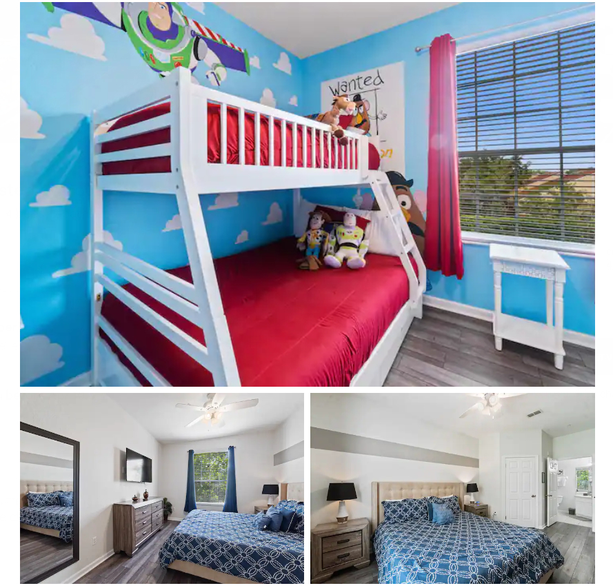 If your family can’t decide on just one Disney theme, maybe you’ll like this home that has bedrooms dedicated to Frozen, Star Wars, and Mickey Mouse. It’s big enough for 10 guests, with 5 bedrooms, 8 beds, and 4 bathrooms. That’s big enough for an extended family Disney World trip!