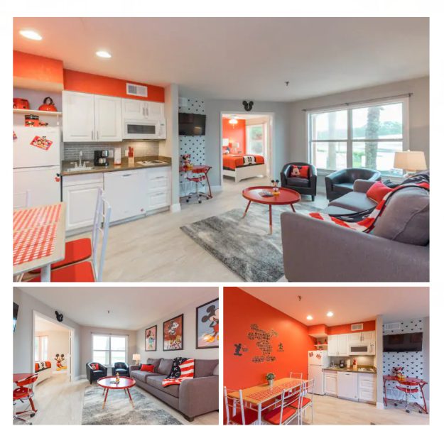 Do you love Mickey Mouse more than anything? Are red and black your signature colors? Then this private villa might be the perfect vacation spot for you! EVERYTHING here is done up in Mickey-themed colors, and you’ll see loads of Mickey artwork throughout. You’ll also get 3 bedrooms with 6 beds and 2 bathrooms.