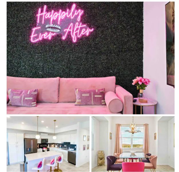 If you want to live the Disney Princess life, you can rent a condo themed to princesses and Happily Ever After! It sleeps up to eight guests and has 2 bedrooms with 5 beds, as well as 2 baths. There’s a gorgeous pink living area with a princess-inspired decor!