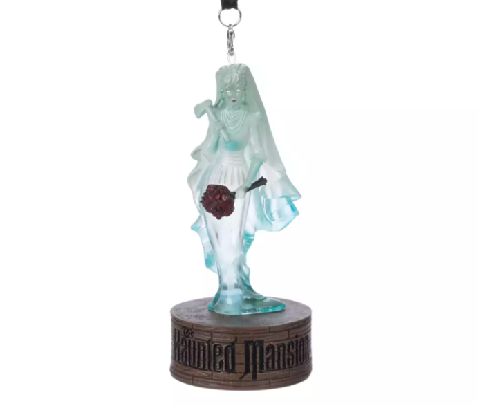 An iconic Haunted Mansion figure is represented in this ornament, which features The Bride holding a bouquet of roses and an ax.