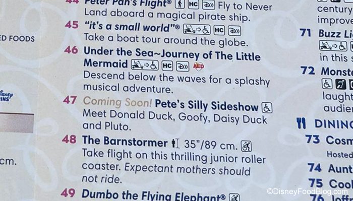 The new map also has the character meet and greet at Pete’s Silly Sideshow as “Coming Soon!” This meet and greet spot features Donald, Daisy, Goofy, and Pluto. However, we’ve spotted Goofy in his usual Pete’s Silly Sideshow outfit visiting guests outside near the Barnstormer, so keep an eye out for that!