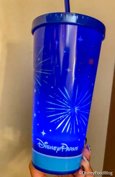 On the back, the fireworks continue and the tumbler says “Disney Parks.” You can see the light comes from the bottom of the cup!