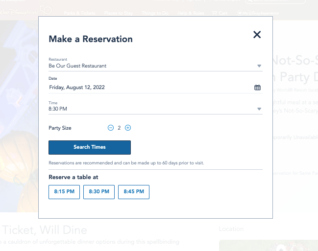 Guests visiting Not-So-Scary in the next 60 days can now book dining for Cinderella’s Royal Table and Be Our Guest Restaurant during party hours. Several times are available, starting after 6PM (when the park closes to regular guests) and heading all the way into the hours of the event (from 7PM-midnight). Guests who want to book these reservations may do so through the My Disney Experience app or the Disney World website.