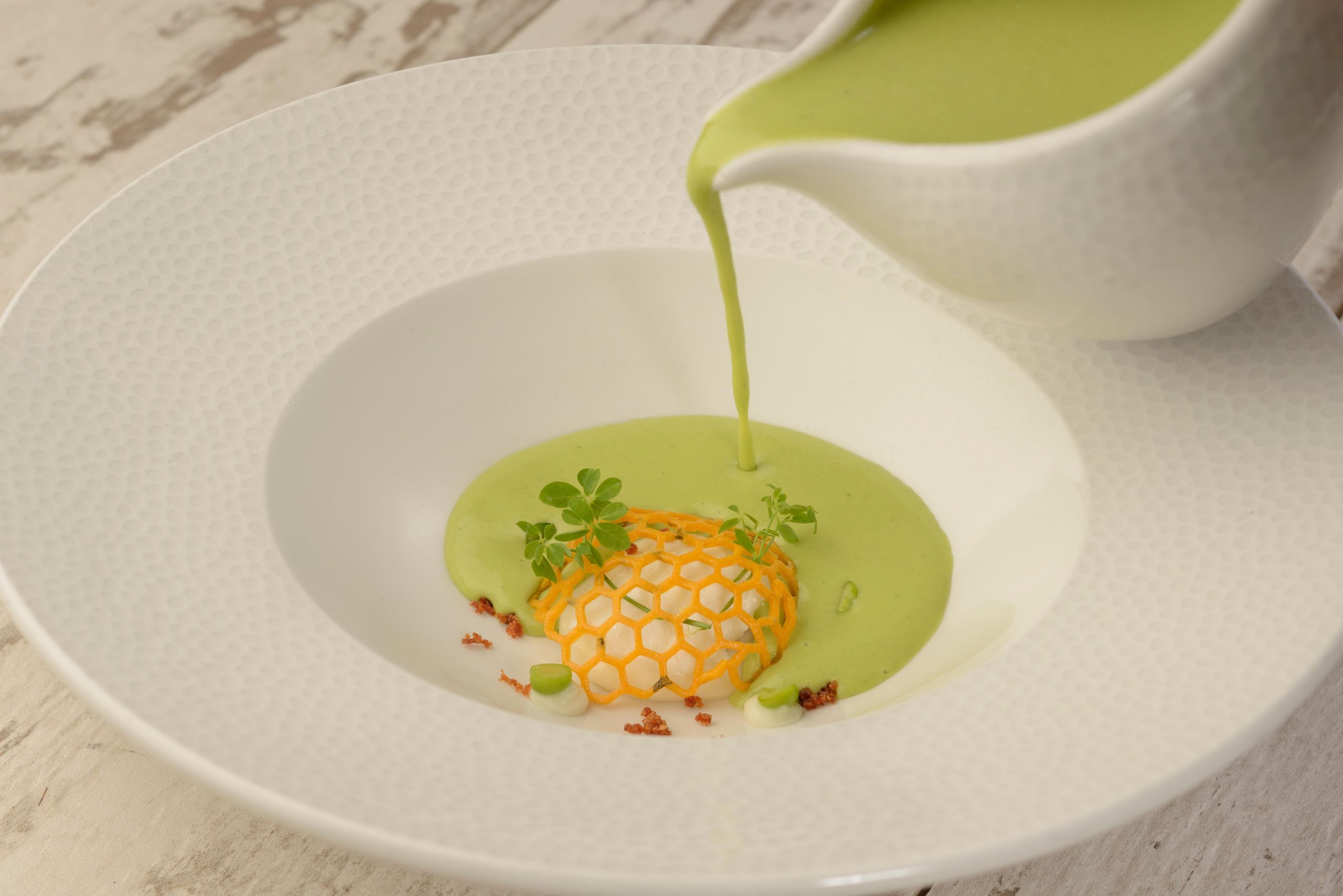 And the Asparagus Soup comes with quail egg, carrot tuile, parmesan, and prosciutto dust for $14.