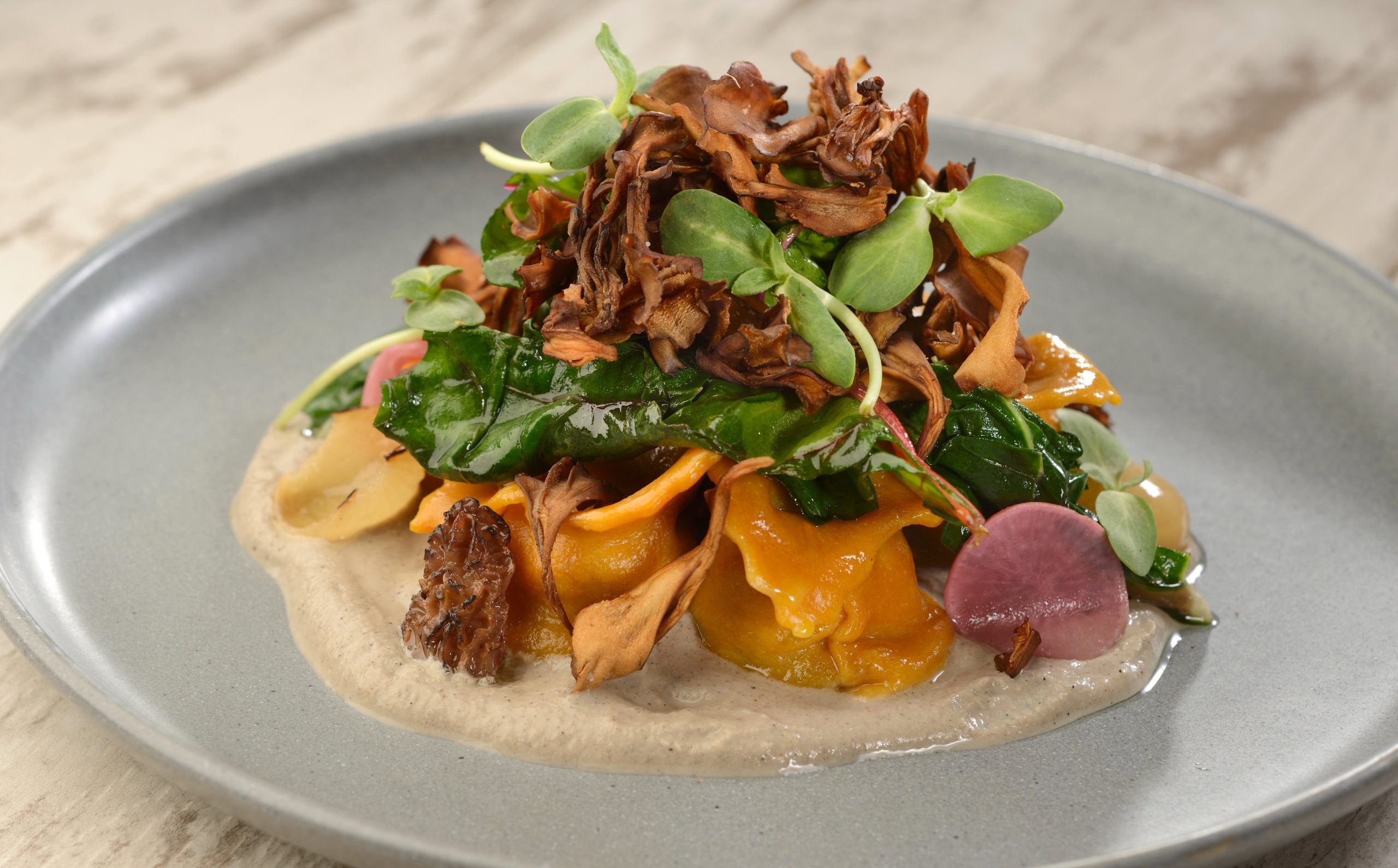 The Tortelloni ai Funghi is made with smoked paprika-mushroom tortelloni, saffron, morels, pickled radish, charred pearl onions, and eggplant-cashew cream for $34.