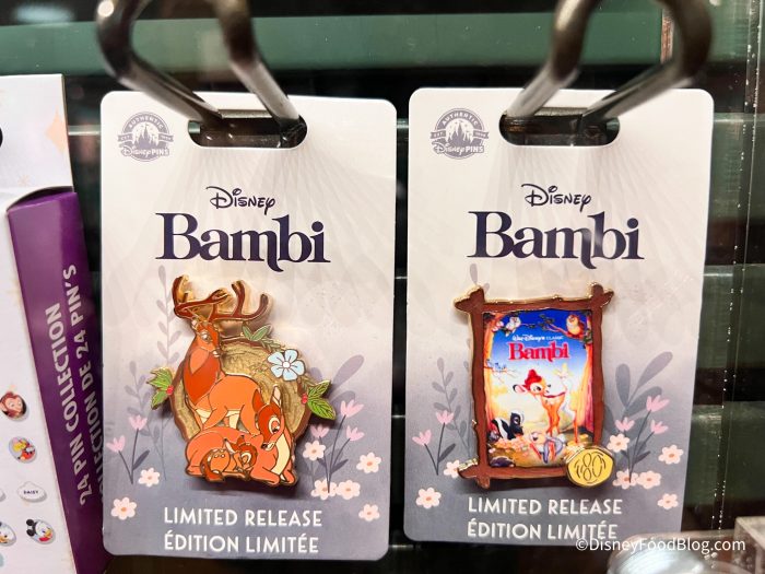 There are also these two — one with Bambi’s family and another that has the Bambi movie poster. These pins are both $17.99. Each of these pins is a limited release and all have the number “80” somewhere on them as they were released for the 80th anniversary of the movie.