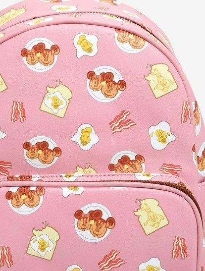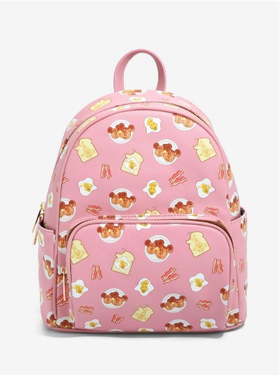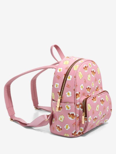The mini-backpack features a print of the Fab Five (Mickey, Minnie, Donald, Goofy, and Pluto) lending their looks to your favorite breakfast foods. Mickey and Minnie showcase their sweetness on the waffles.