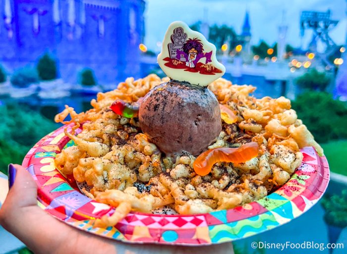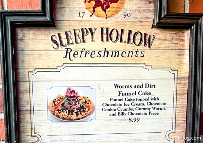 Over at Sleepy Hollow Refreshments, you can find the new Worms and Dirt Funnel Cake! This is a funnel cake topped with chocolate ice cream, chocolate cookie crumbs, gummy worms, and a Billy chocolate piece.