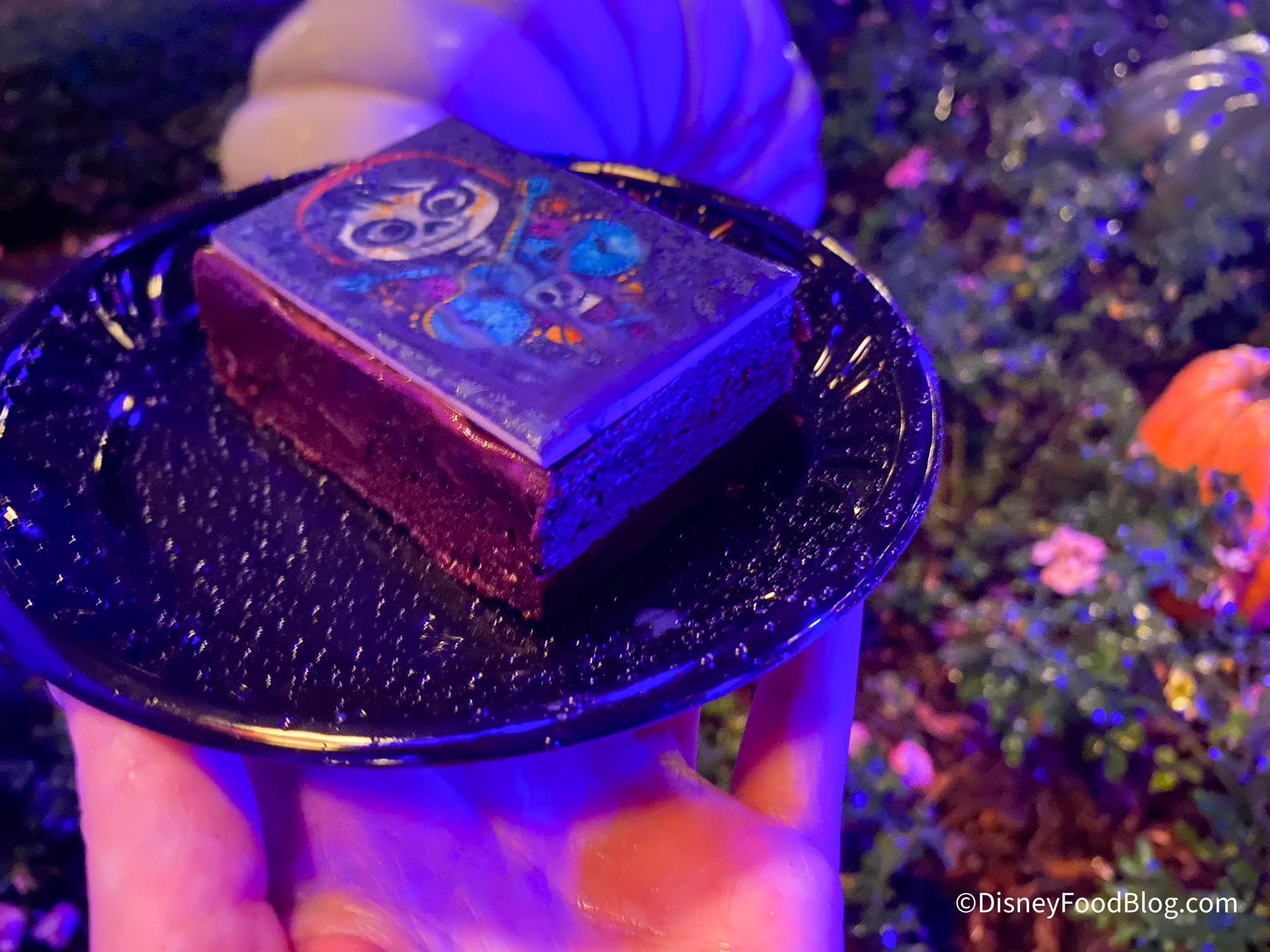 During Mickey’s Not-So-Scary Halloween Party, you can find some EXCLUSIVE snacks only available to those attending the festivities. One of those is the NEW Mexican Spiced Hot “Coco” Brownie, available at the popcorn cart near Cinderella Castle.