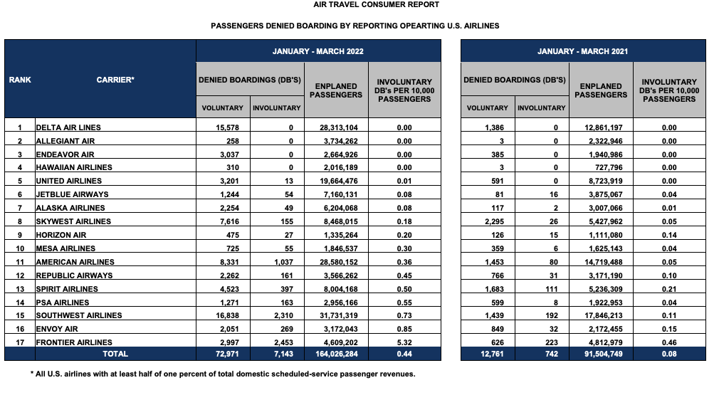 With so much uncertainty surrounding the airline industry, passengers have been faced with delays, cancelations, and being completely bumped from overbooked flights. The Office of Aviation Consumer Protection has created the Air Travel Consumer Report which shows the airlines that are most likely to involuntarily bump you from your flight.