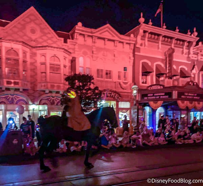 Then, the parade kicks off with the Headless Horseman riding on the parade route!
