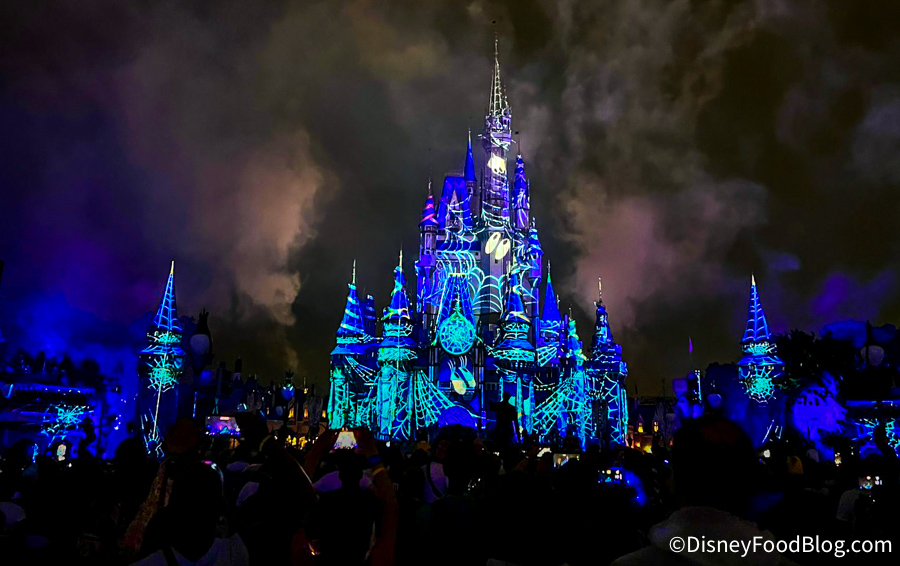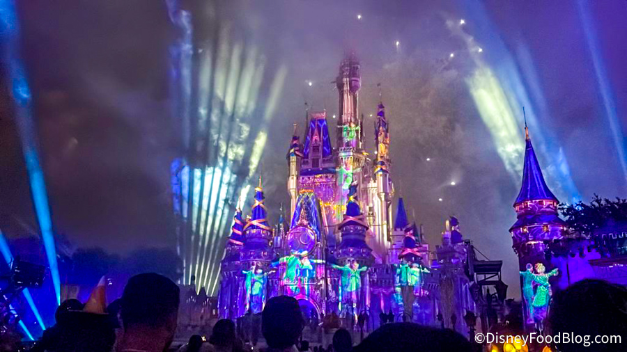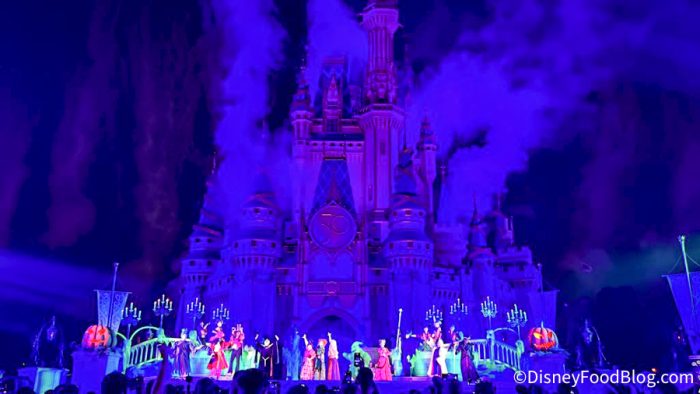 This is a stage-show that takes place on the Cinderella Castle stage. During the show, the Sanderson Sisters call upon other Disney villains to help them create the Hocus Pocus Party Potion! The show was supposed to take place at 8:35PM, 10:45PM, and midnight! The first show was delayed due to weather, but did take place, but the second one was canceled. However, the midnight show did go on!