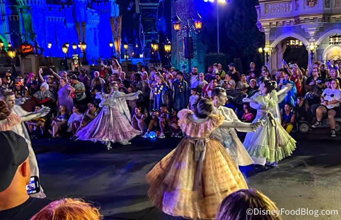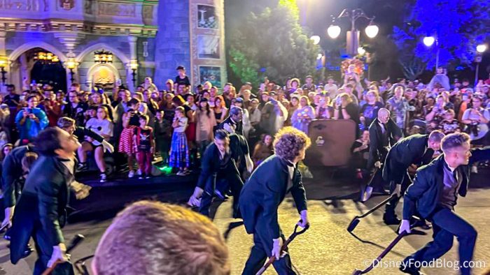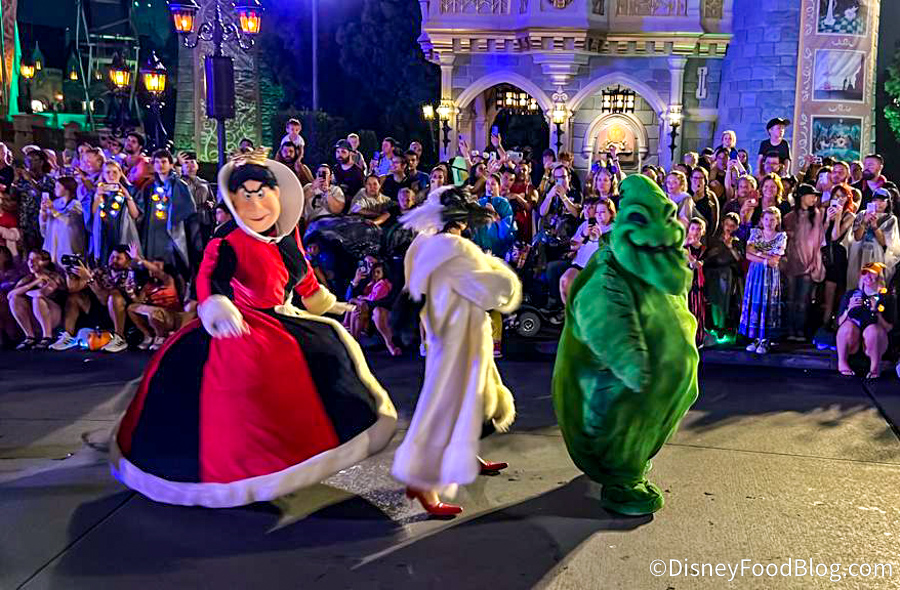The parade features characters dressed up in their Halloween costumes, plus some unique characters like the grave digging ghosts from the Haunted Mansion.