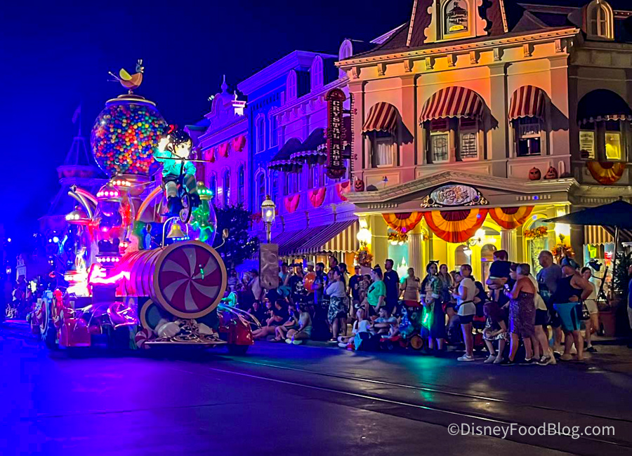 The Boo To You Parade is offered twice each party night at 9:15 and 11:15PM. Unfortunately, on the opening night of the party, the first parade was canceled due to rain. But, the second parade happened!