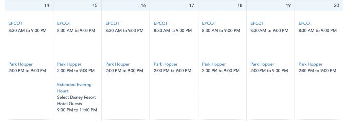 EPCOT is open from 8:30AM to 9PM every single day next week.