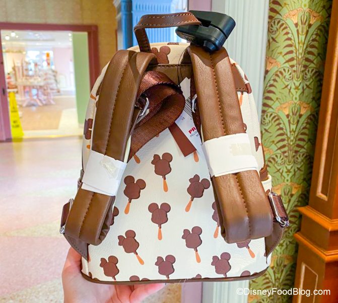 Well, even MORE Mickey Bar stuff has arrived in Disney World and Disneyland. First, in Disney World, we came across a Loungefly Mickey Bar Mini Backpack — and it looks good enough to eat! It’s got a yummy-looking giant Mickey Bar on the front…