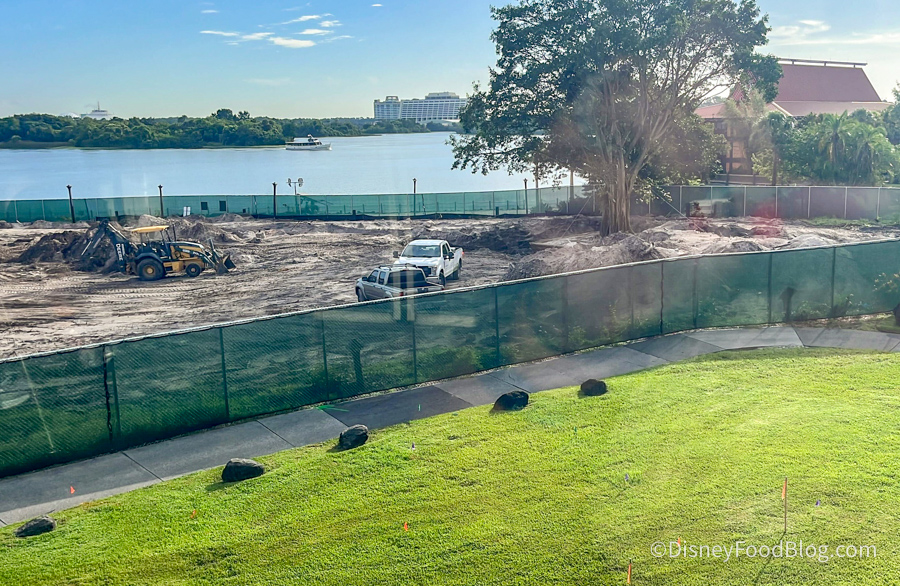 Last time we checked in on the Polynesian construction, the ground had been completely leveled and there was nothing but dirt. Now, it looks like more dirt has been added or just piled up around the lot, and some machines have moved in.