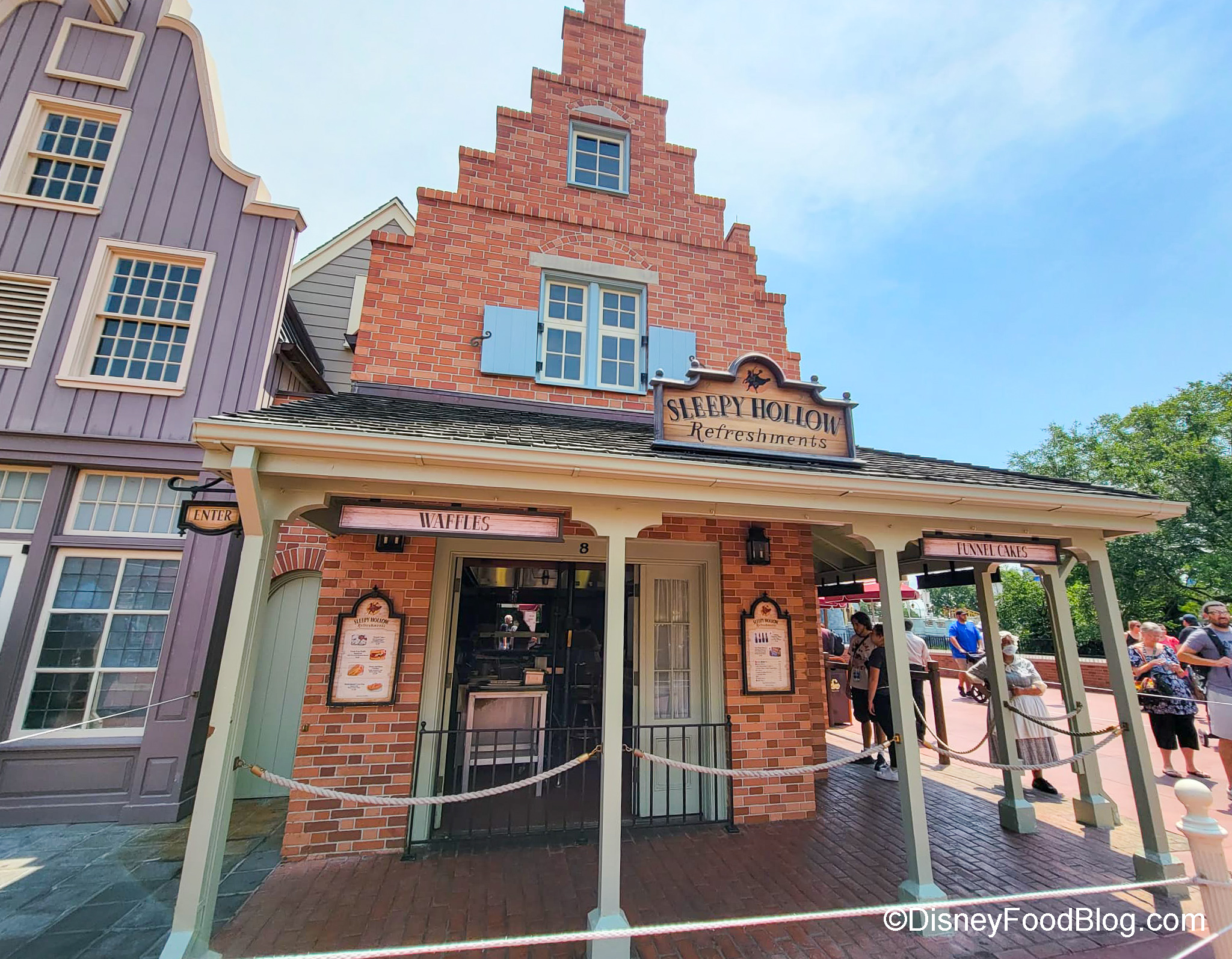 Sleepy Hollow is tucked away in Liberty Square with some unique views of Cinderella Castle, and here you can find Mickey waffles, funnel cake, a Haunted Mansion-themed push-pop, and the delicious Fresh Fruit Waffle Sandwich.