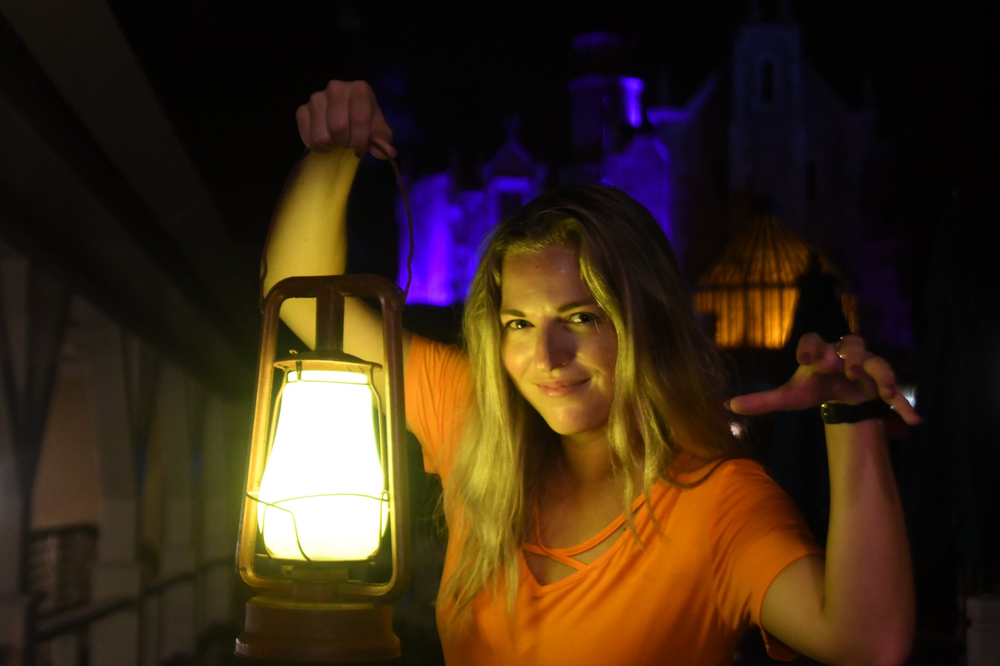 While you’re in the Liberty Square neighborhood, picking up hitchhiking ghosts, grab a lantern for a photo as if you’re exploring the nearby graveyard.