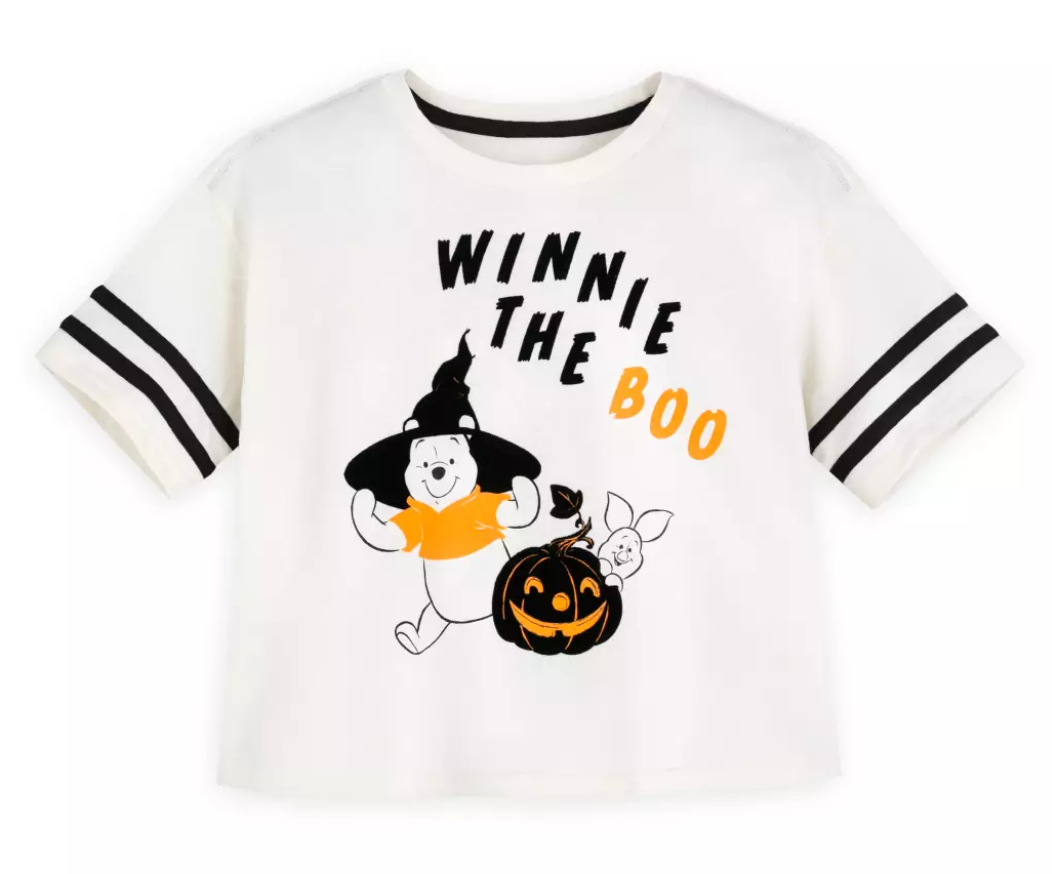 This top is semi-cropped and made of half cotton half polyester. Pooh is holding onto his witch’s hat while Piglet peeks out from behind a jack-o-lantern, and both exclaim “Winnie the Boo!” This would be a great shirt to wear to school the week before Halloween!