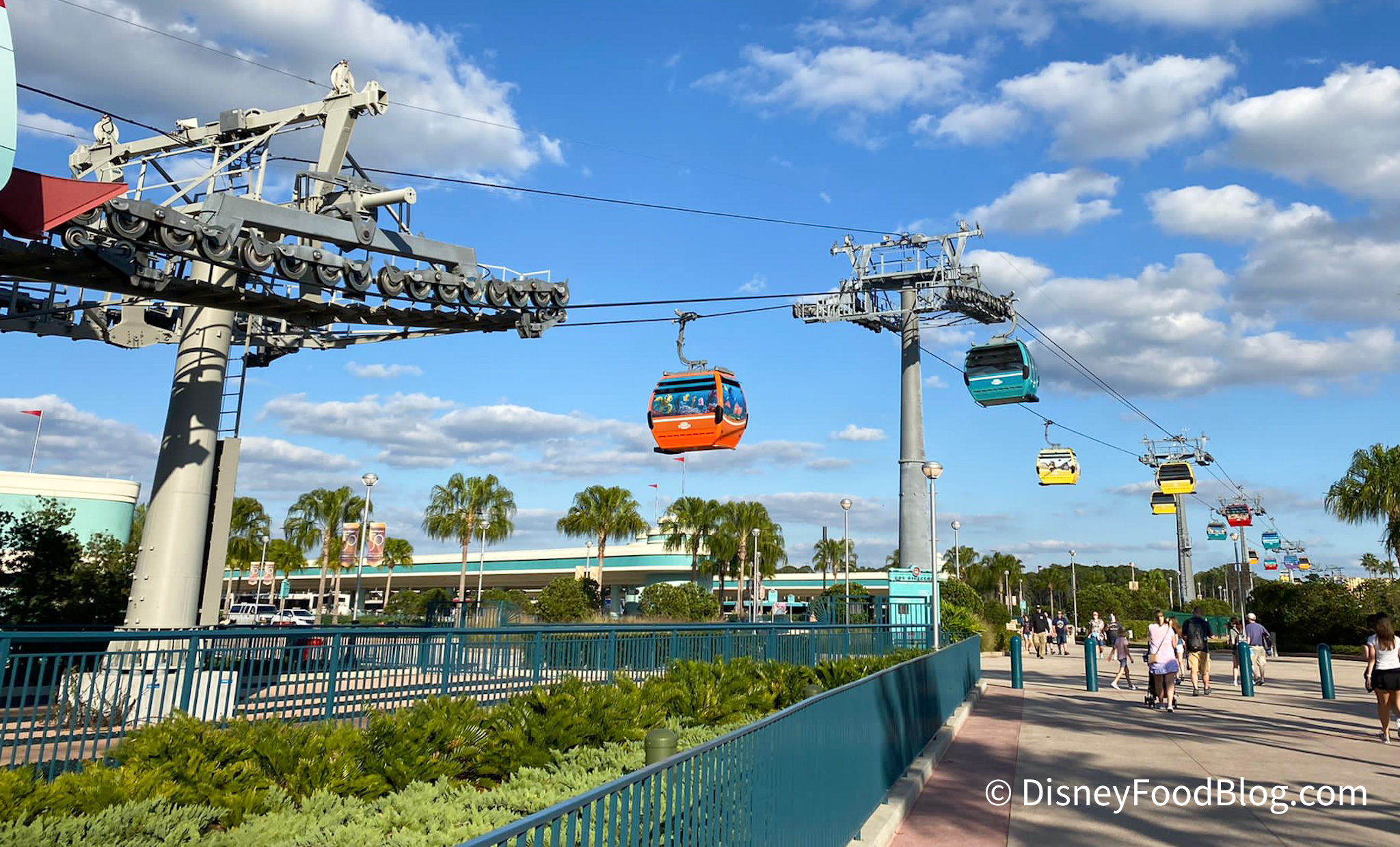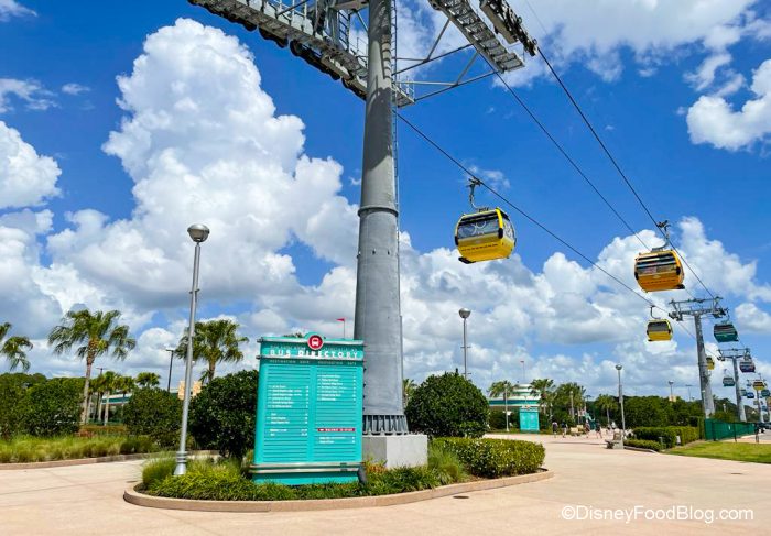 Disney’s Skyliner is a convenient way to get from one place to another in Disney World. There are currently stops at EPCOT, Hollywood Studios, Disney’s Caribbean Beach Resort, and Pop Century and Art of Animation Resorts.