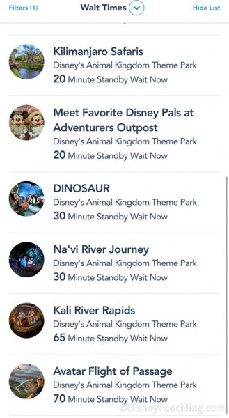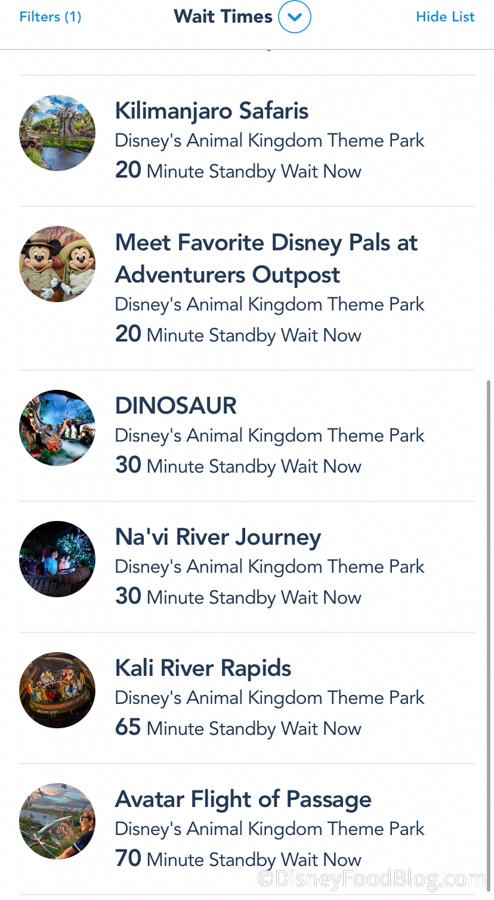 But, in Animal Kingdom, some of the wait times weren’t that bad. Kilimanjaro Safaris only had a 20 minute wait, and Na’vi River Journey only had a 30 minute wait. Kali River Rapids and Flight of Passage were still over an hour, though.
