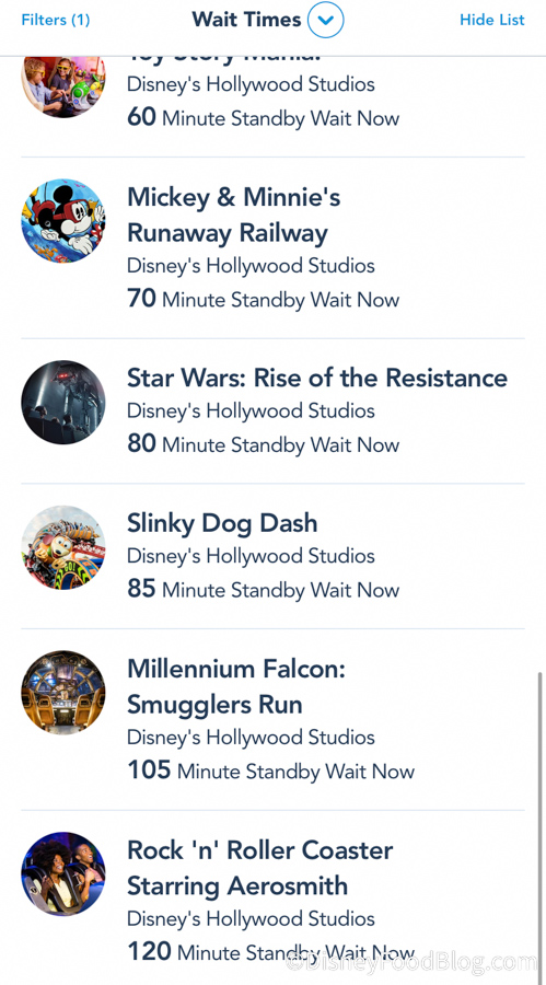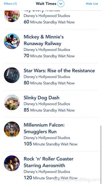 …and in Hollywood Studios, a BUNCH of rides had wait times over an hour.