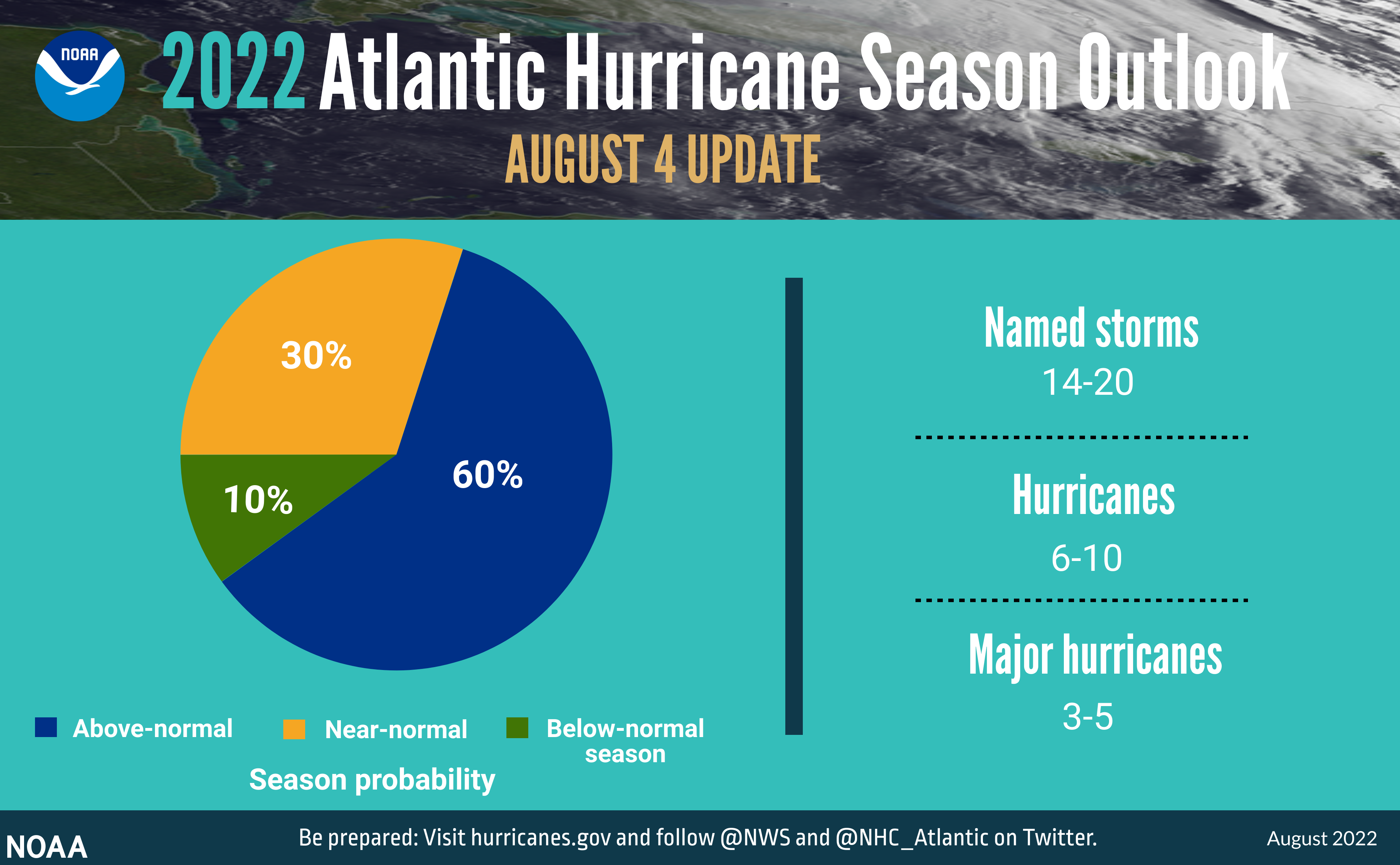 The National Oceanic and Atmospheric Administration (NOAA) has also predicted an above-average hurricane season for 2022 in the Atlantic. NOAA initially forecasted a range of 14-21 named storms, 6-10 hurricanes, and 3-6 major hurricanes. That has since been updated slightly, which we’ll discuss in a minute.