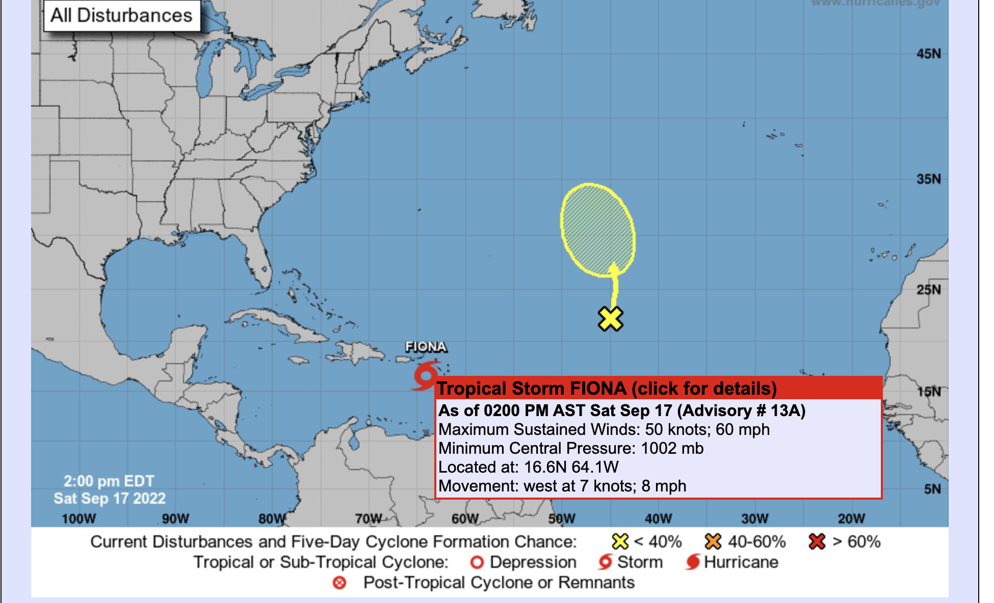 UPDATE: As of mid-September 2022, NOAA is primarily tracking two disturbances. The disturbance in yellow has a low, 20% chance of formation in the next 5 days. But, the other one is Tropical Storm Fiona. Hurricane conditions are expected to impact parts of Puerto Rico on Sunday and Sunday night (September 18th). Hurricane conditions are also possible along the U.S. Virgin Islands Saturday (September 17th) and Sunday (September 18th).