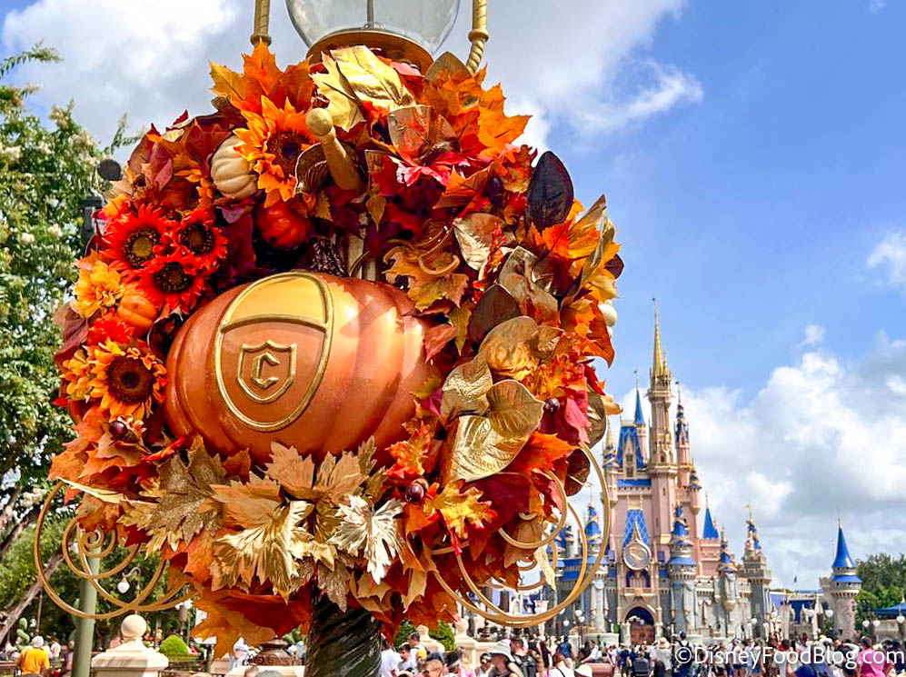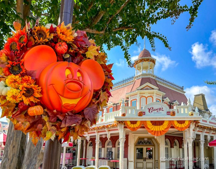 When walking toward the castle, we noticed something different. We spotted those burnt orange-colored wreaths off in the distance! Could it be? Had our Mickey Pumpkin Wreaths returned?!