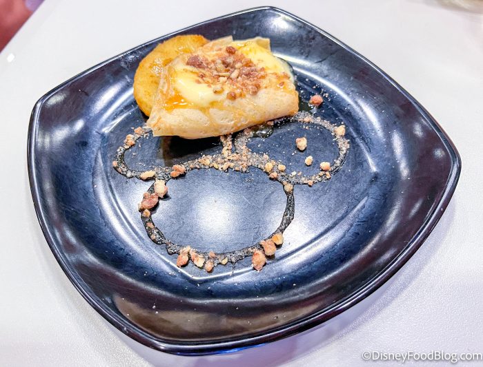 Then it was time to check out the Caramel Apple Crepe with Toasted Pecans and Sweet Cream. First of all, we’ve got to give top marks for presentation here. Any dish with a hidden (or not-so-hidden) Mickey gets a 5/5 for presentation from us!