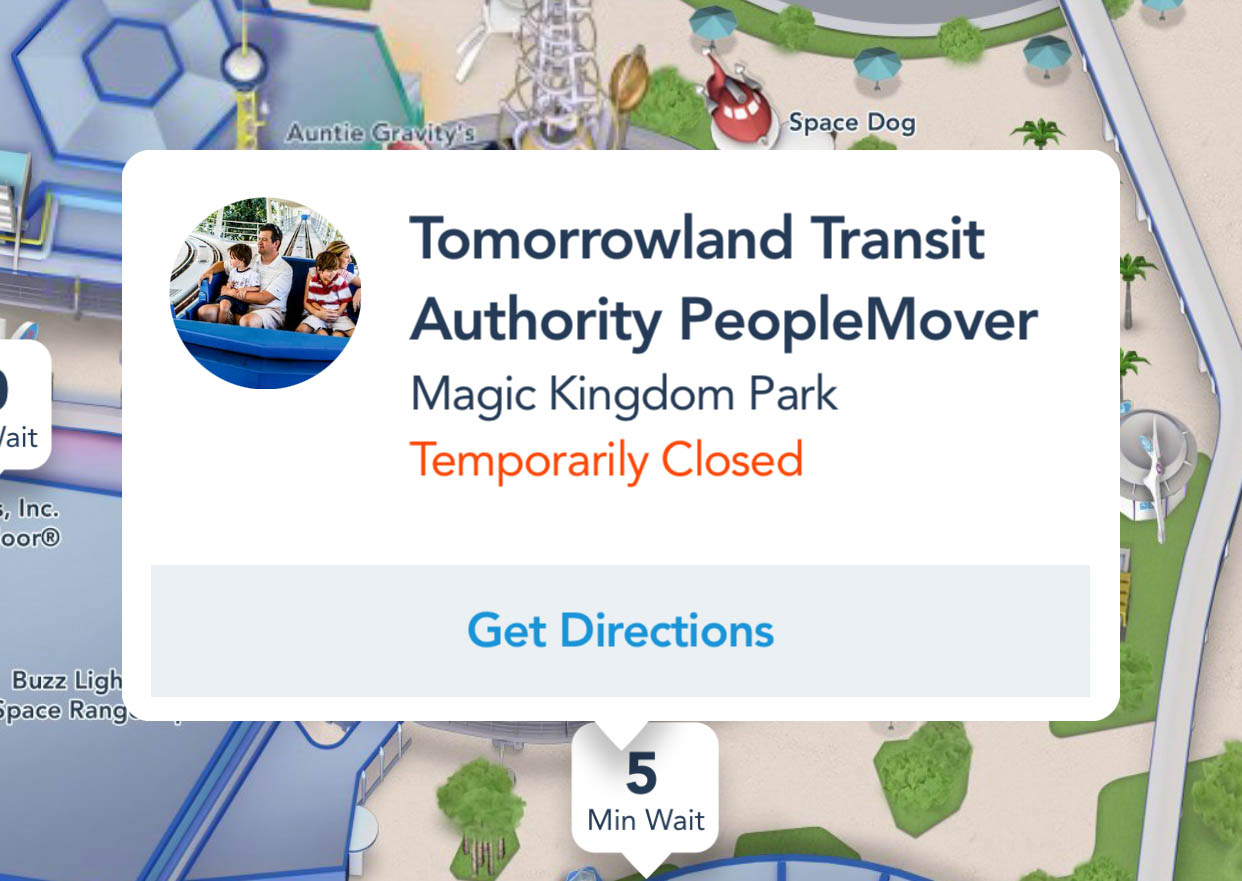 If you’re in Magic Kingdom and want to ride the PeopleMover, keep an eye on the My Disney Experience app to see when the ride may reopen. At the time of writing, the PeopleMover is listed as temporarily closed, and Cast Members could not confirm whether the technical difficulties would be resolved.