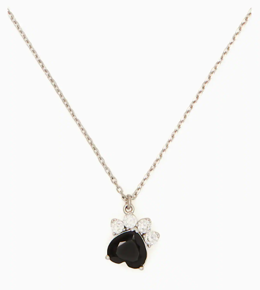 Each paw is made of a black heart stone with sparkling white crystals surrounding it. This delicate pendant is part of the line, which also includes two different styles of earrings. Buy all three to mix and match, or wear each on their own for an understated look.