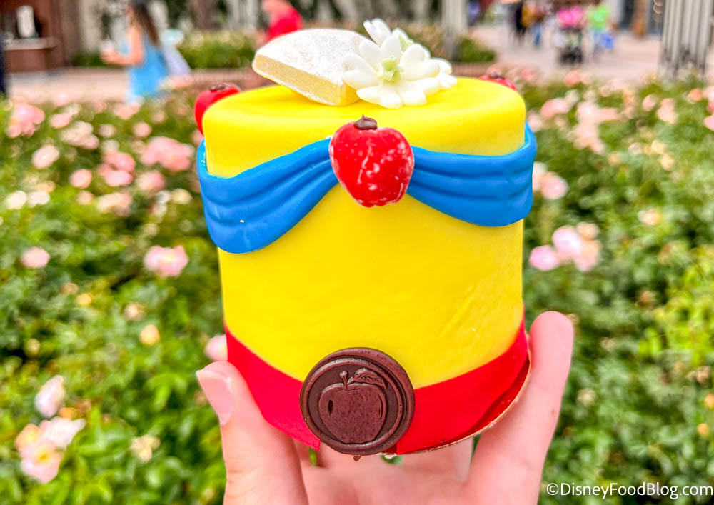 - Snow White 85th Anniversary Petit Cake: Vanilla chiffon cake layered with apple mousse and cinnamon mousse with white chocolate crunch pearls (New)