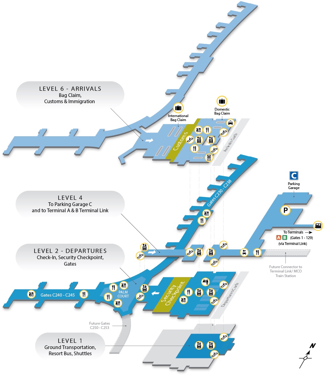 Orlando International Airport also recently Tweeted a map of what the new terminal is going to look like. The upper-most level of the terminal, Level 6, will be where Arrivals is, and Departures will be at Level 2. Based on this map, it looks like a majority of the food locations are going to be on Level 2, with other locations on Level 4 and Level 6. Security will be on Level 2, as well.