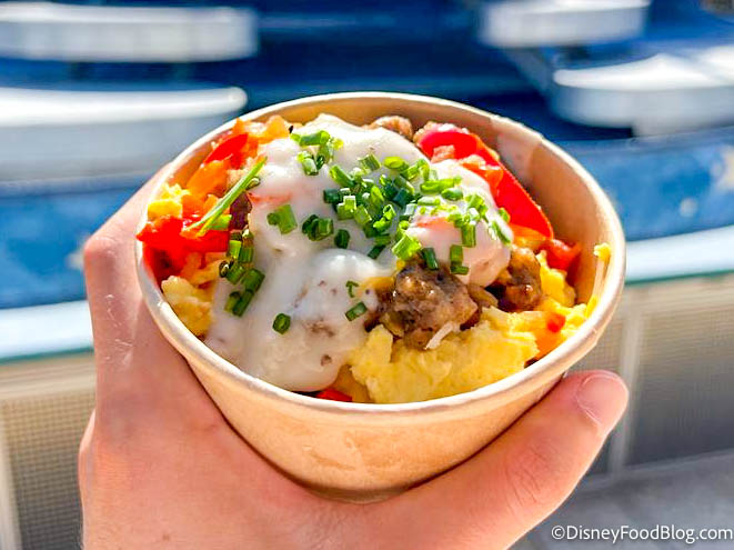 Introducing the NEW Galactic Breakfast Bowl from Galactic Grill in Disneyland. This new dish arrived recently with several other new items at Disneyland Resort. These are made with Seasoned Potato Bites topped with Scrambled Eggs, Cheese, Maple Sausage, and Country Gravy.