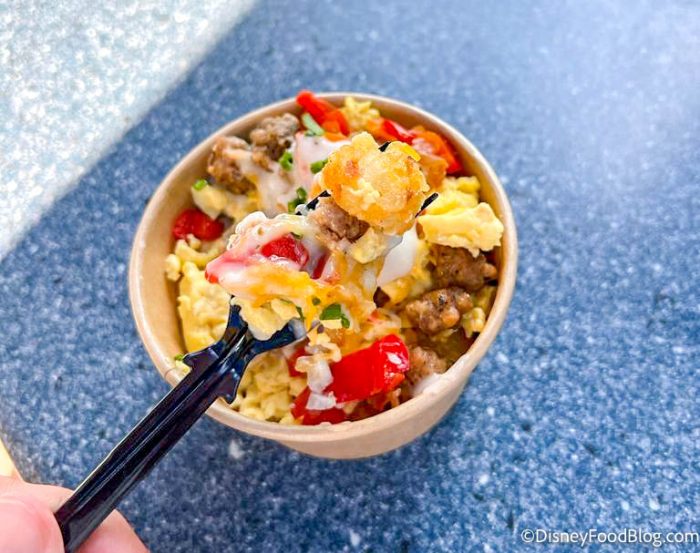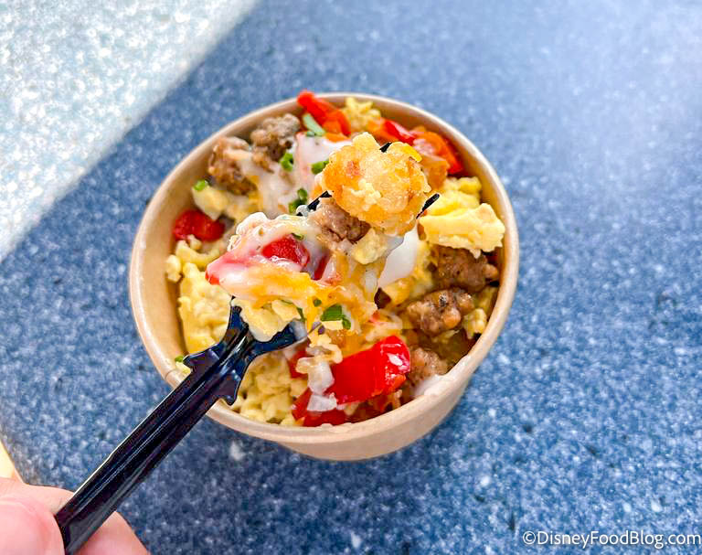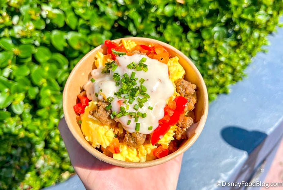 We know what you’re thinking. Wait a minute…don’t those sound and look kinda like the Breakfast Bowl available at Woody’s Lunch Box in Disney’s Hollywood Studios?! And, well, you’d be right. The Woody’s Lunch Box version comes with potato barrels, smothered in smoked brisket, scrambled eggs, and country gravy. The finishing touch is the green onion garnish. So they’re pretty similar, except that the Disneyland version has maple sausage instead of brisket and some red peppers on top.