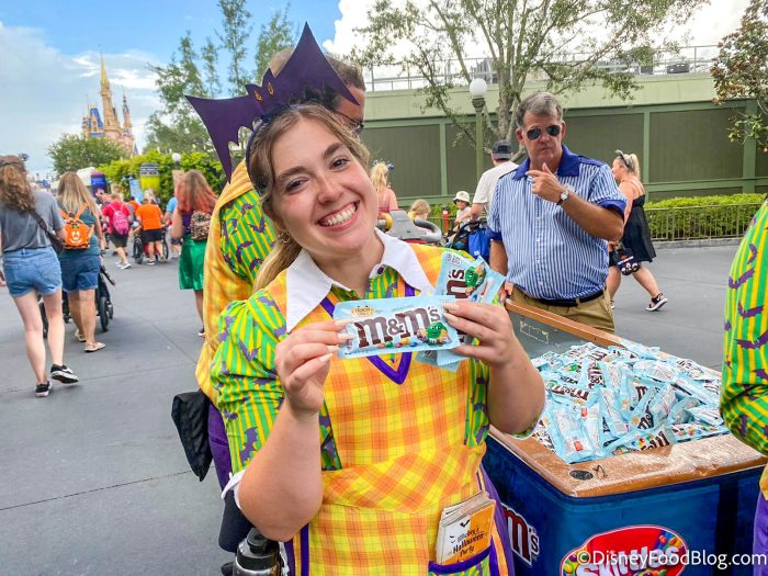 At most trick-or-treat locations, Disney Cast Members pass out “fun-sized” packets of Mars-Wrigley candy. You’ll get treats like M&Ms, Skittles, Twix bars, etc.
