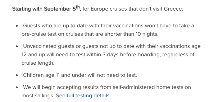 For European cruises (so long as they don’t visit Greece), guests who are “up to date” with their COVID-19 vaccines won’t have to take a pre-cruise COVID-19 test for sailings that are shorter than 10 nights. Unvaccinated guests and those who are not “up to date” on their COVID-19 vaccines, ages 12 and up, will need to take a COVID-19 test within 3 days of boarding.