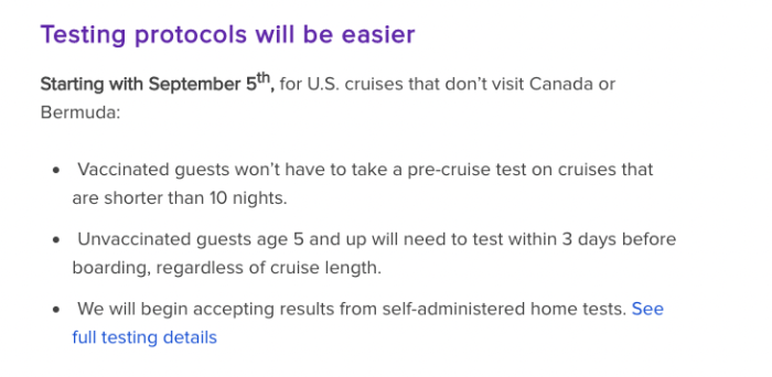 Royal Caribbean has also announced that their COVID-19 testing requirements will be “easier.” Starting on September 5th (for all U.S. cruises that don’t visit Canada or Bermuda), vaccinated guests won’t need to take a pre-cruise COVID-19 test for any cruise that is shorter than 10 nights.