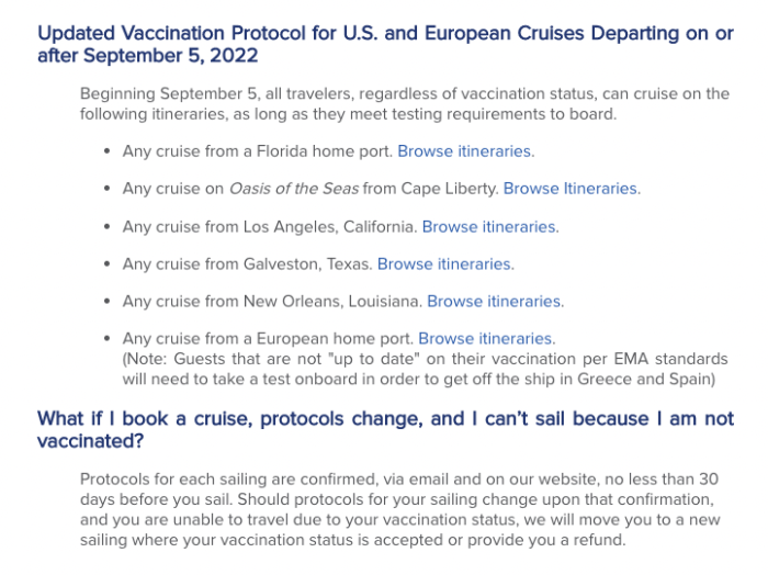Previously, Royal Caribbean announced that it would no longer require COVID-19 vaccines for cruises that were less than 6 nights. Then it announced that it would remove vaccination requirements entirely for cruises departing from certain ports.