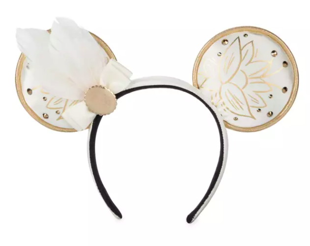 The Princess Tiana Minnie Ears feature a classy, gorgeous white-and-gold color scheme. There is a golden lotus on each ear, accompanied by gold studs for extra sparkle. The satin bow and feather details are completed by a gold jewel that matches the piping on the edge of each ear.